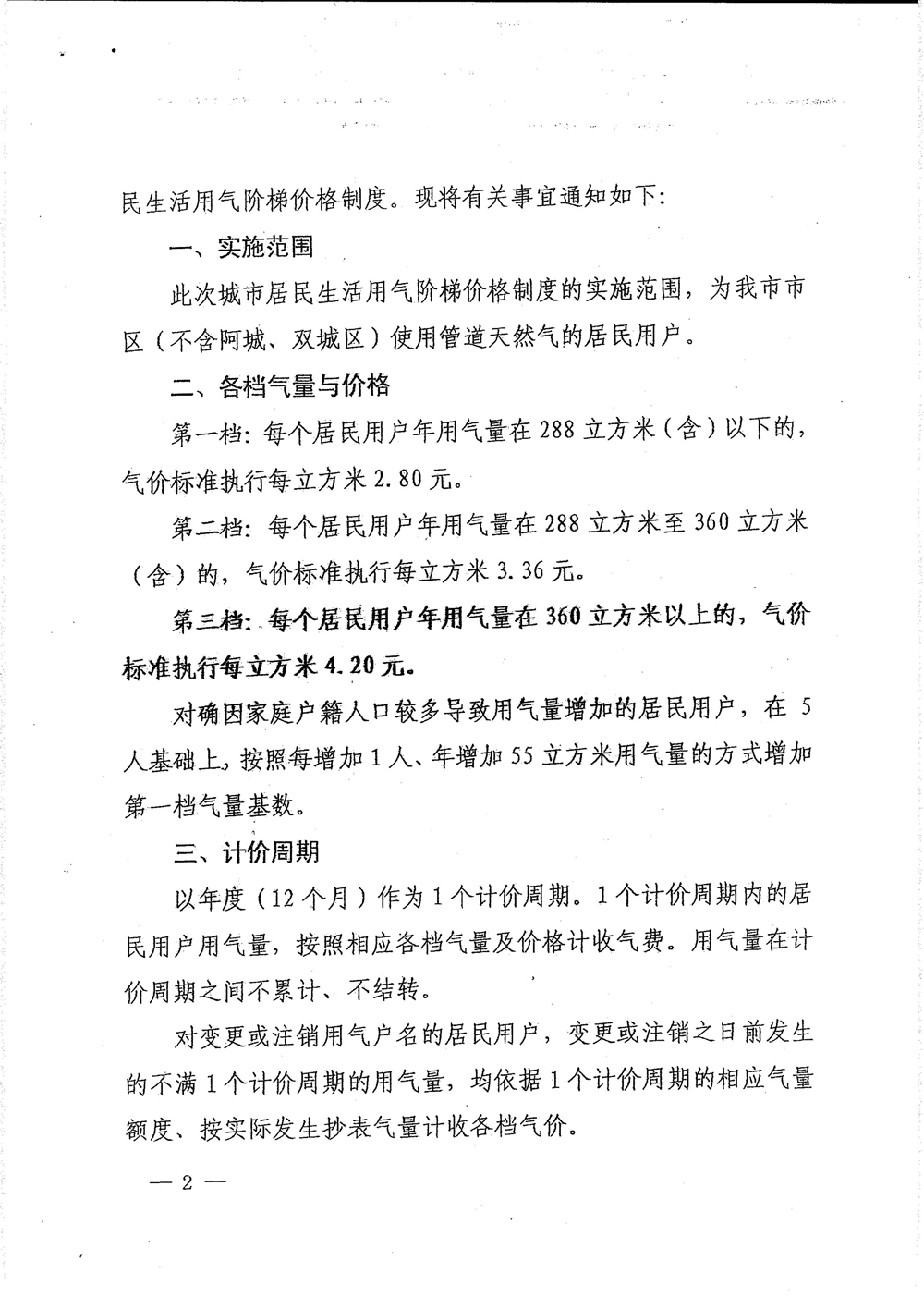 哈爾濱市人民政府辦公廳關(guān)于實行城市居民生活用氣階梯價格制度的通知