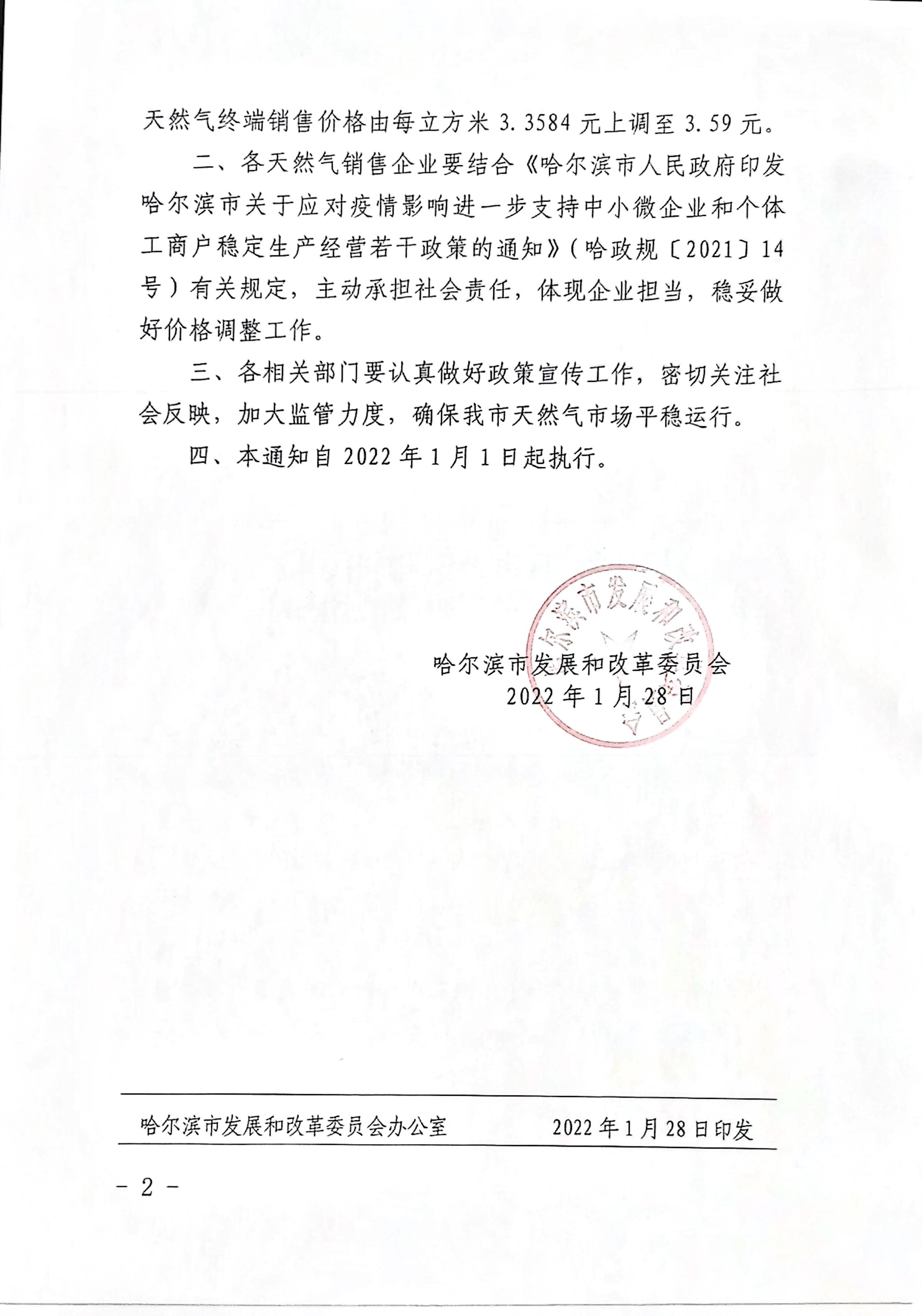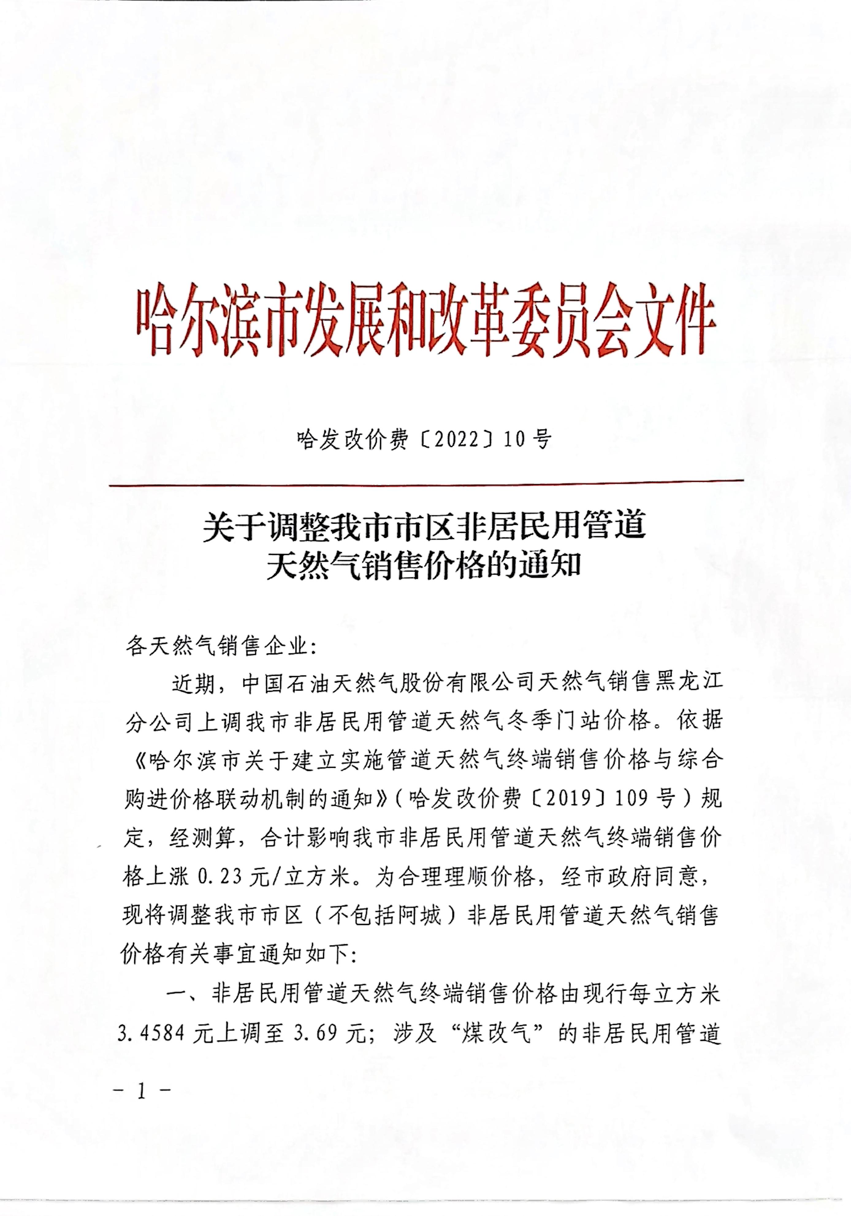 《關(guān)于調(diào)整我市市區(qū)非居民用管道天然氣銷售價(jià)格的通知》(哈發(fā)改價(jià)費(fèi)〔2022〕10號(hào))