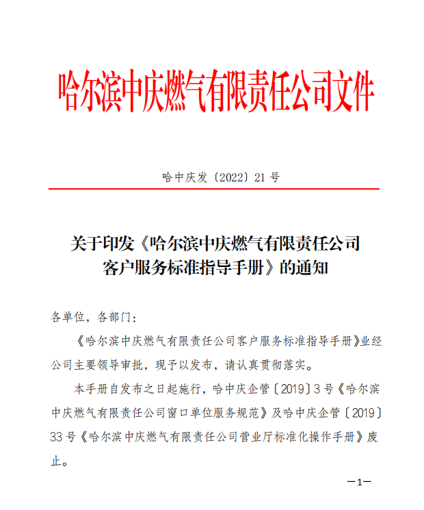 哈中慶發(fā)〔2022〕21號關(guān)于印發(fā)《哈爾濱中慶燃?xì)庥邢挢?zé)任公司客戶服務(wù)標(biāo)準(zhǔn)指導(dǎo)手冊》的通知