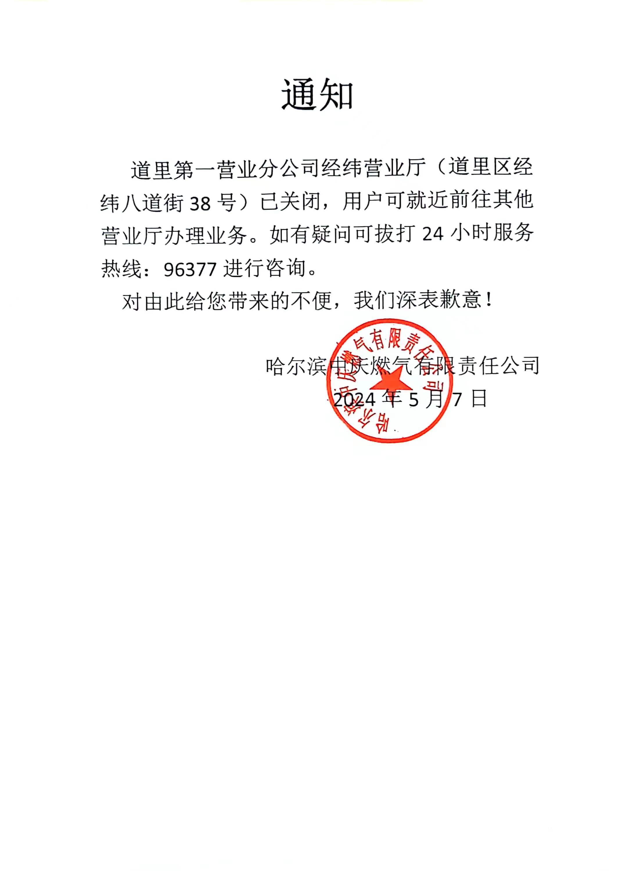 道里第一營(yíng)業(yè)分公司經(jīng)緯營(yíng)業(yè)廳停業(yè)通知