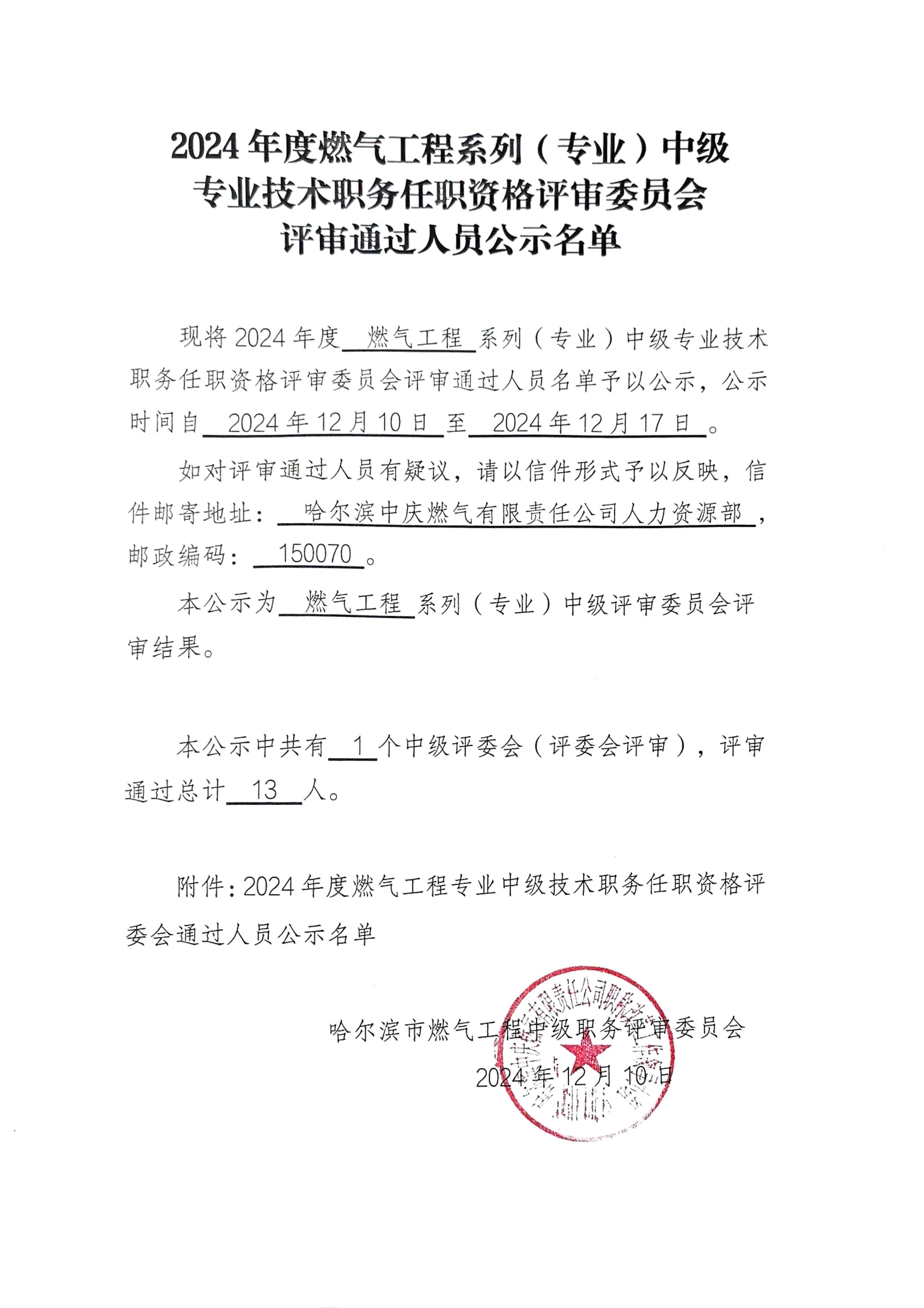 2024年度燃?xì)夤こ滔盗校▽?zhuān)業(yè))中級(jí)專(zhuān)業(yè)技術(shù)職務(wù)任職資格評(píng)審委員會(huì)評(píng)審?fù)ㄟ^(guò)人員公示名單